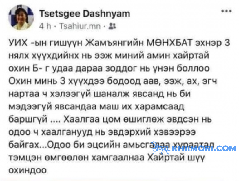 Тэрбээр “УИХ-ын гишүүн Жамъянгийн Мөнхбат эхнэр, гурван нялх хүүхдийнх нь ээж, миний амин хайртай охин Б-г удаа дараа зоддог нь үнэн боллоо. Охин минь гурван хүүхдээ бодоод аав, ээж, ах, эгч, нартаа ч хэлээгүй шаналж явсанд нь би мэдээгүй явсандаа харамсаад баршгүй.